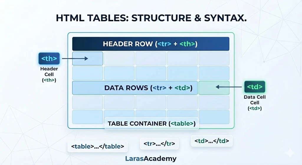 1. Never Use for Layout: In the 90s, developers used tables to design entire websites. Today, this is a huge mistake. Tables are for Data only. Use CSS Flexbox/Grid for layouts.
